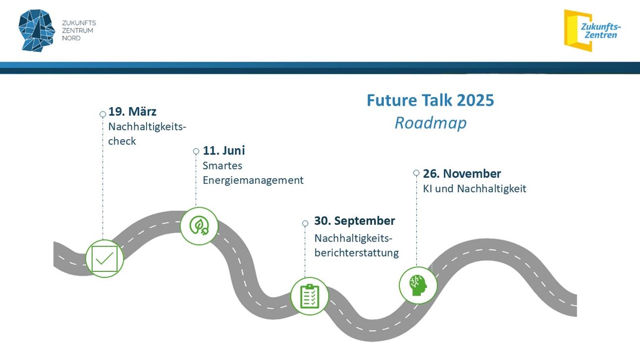 Der FutureTalk 2025 steht unter dem Motto Nachhaltigkeit und Energieeffizienz. Wir starten mit einem Tool, mit dem Sie den Status Quo in Ihrem Unternehmen feststellen können, bieten Einblicke in die neuesten Trends und Technologien des intelligenten Energiemanagements und sprechen darüber, warum Nachhaltigkeitsberichterstattung auch für KMU interessant ist. Zum Ende des Jahres geht es um die Frage, wie KI sich mit Nachhaltigkeit vereinbaren lässt.